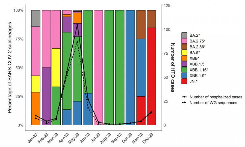 Kết quả giải mã trình tự gen được tiến hành bởi Bệnh viện Bệnh Nhiệt đới và Đơn vị Nghiên cứu Lâm sàng Đại học Oxford (OUCRU) từ mẫu bệnh phẩm của 16 bệnh nhân dương tính với SARS-CoV-2 điều trị tại Bệnh viện Nhiệt đới trong tháng 12/2023 ghi nhận có 12/16 bệnh nhân (75%) nhiễm biến thể phụ của Omicron JN.1, ngoài ra có 1 ca nhiễm biến thể JN.1.1; 2 ca BA.2.86.1 và 1 ca XDD. Dấu hiệu đáng lo ngại là số ca nhập viện tại BV Bệnh Nhiệt đới do COVID-19 có xu hướng gia tăng dần trong sáu tuần gần đây.