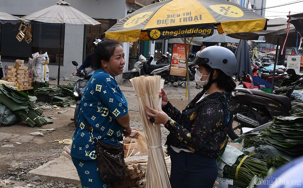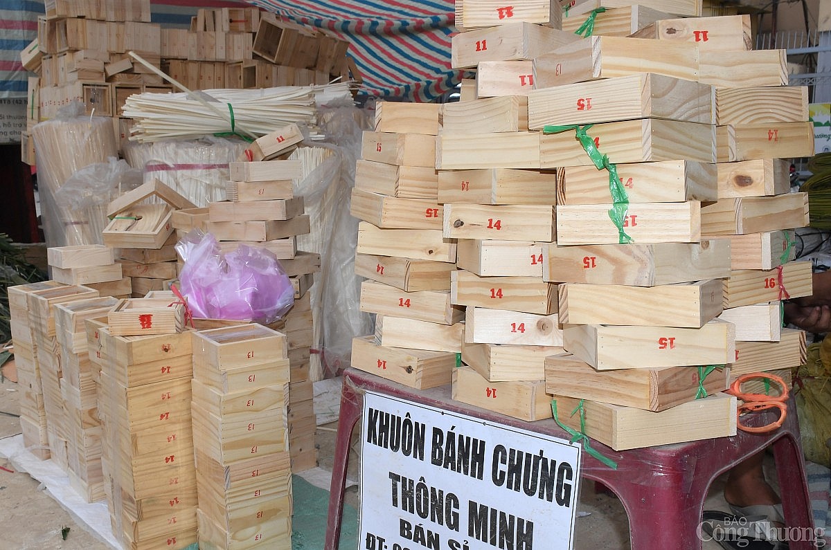 Cùng với bán lá dong, các loại khuôn gói bánh chưng thông minh có giá dao động từ 20-30.000 đồng/cái tùy kích thước; dây lạt cũng được tiểu thương bán giá 10.000 đồng/bó nhỏ, 100.000 đồng/bó lớn. Ảnh: Thanh Minh. |