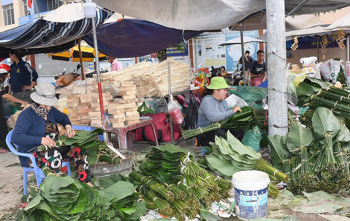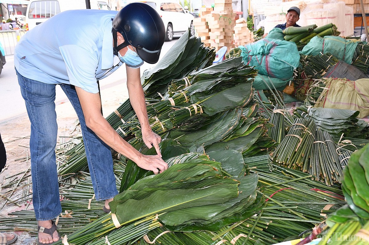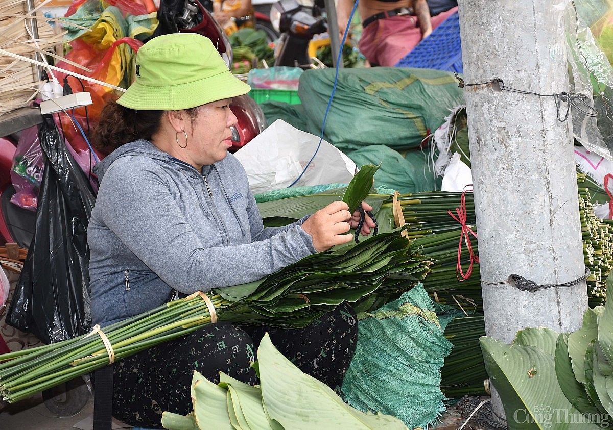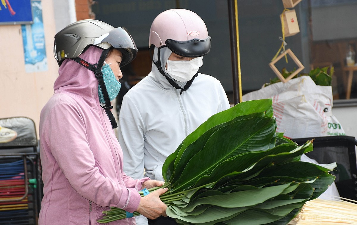 | Trong lúc chờ đợi khách mua, tiểu thương cắt tỉa lại phần rìa lá dong cho đẹp hơn để khách chọn mua. Ảnh: Thanh Minh. |