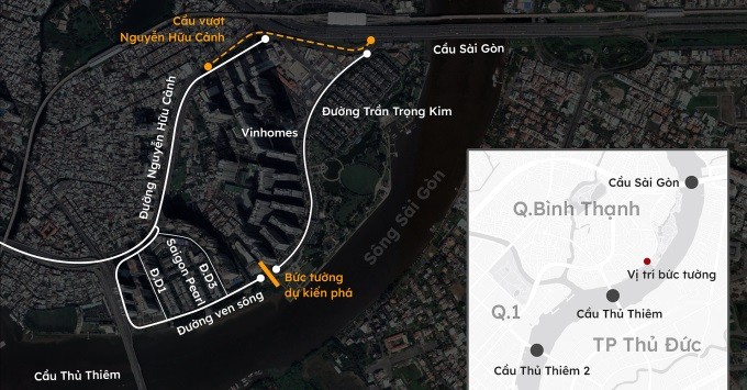 UBND TP. Hồ Chí Minh vừa có chỉ đạo, giao cho các đơn vị liên quan nghiên cứu, đề xuất thực hiện phương án phá bỏ bức tường ngăn cách khu dân cư Vinhomes và khu dân cư Saigon Pearl để kết nối giao thông đường ven sông Sài Gòn được đồng bộ, an toàn trước ngày 31/12/2023.