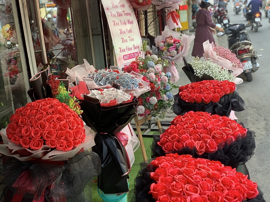 Để chuẩn bị hoa phục vụ cho dịp Lễ tình nhân năm nay, các cửa hàng đã phải đặt hoa từ trước Tết và cho nhập về cách đây 2-3 ngày. Tuy giá có tăng cao nhưng hoa tươi vẫn khá hút khách. Chị Lê Thị Lan, chủ cửa hàng hoa tại chợ hoa Đầm Sen chia sẻ, hôm nay, lượng khách đặt hoa tươi tăng gấp 2 lần so với ngày thường. Nhiều khách hàng đặt hàng từ trước cho dịp này và đăng ký giao hàng đến địa chỉ người nhận vào đúng ngày 14/2. Bên cạnh các loại hoa mới, năm nay cửa hàng cũng chú trọng cách trang trí để thu hút khách hàng hơn. Các bó hoa không chỉ bó đơn thuần như trước mà còn dùng các kiểu tạo hình, tạo lẵng. Bó hoa kết hợp cùng những món quà đi kèm như bánh, socola, mỹ phẩm...” - chị Lan cho biết.