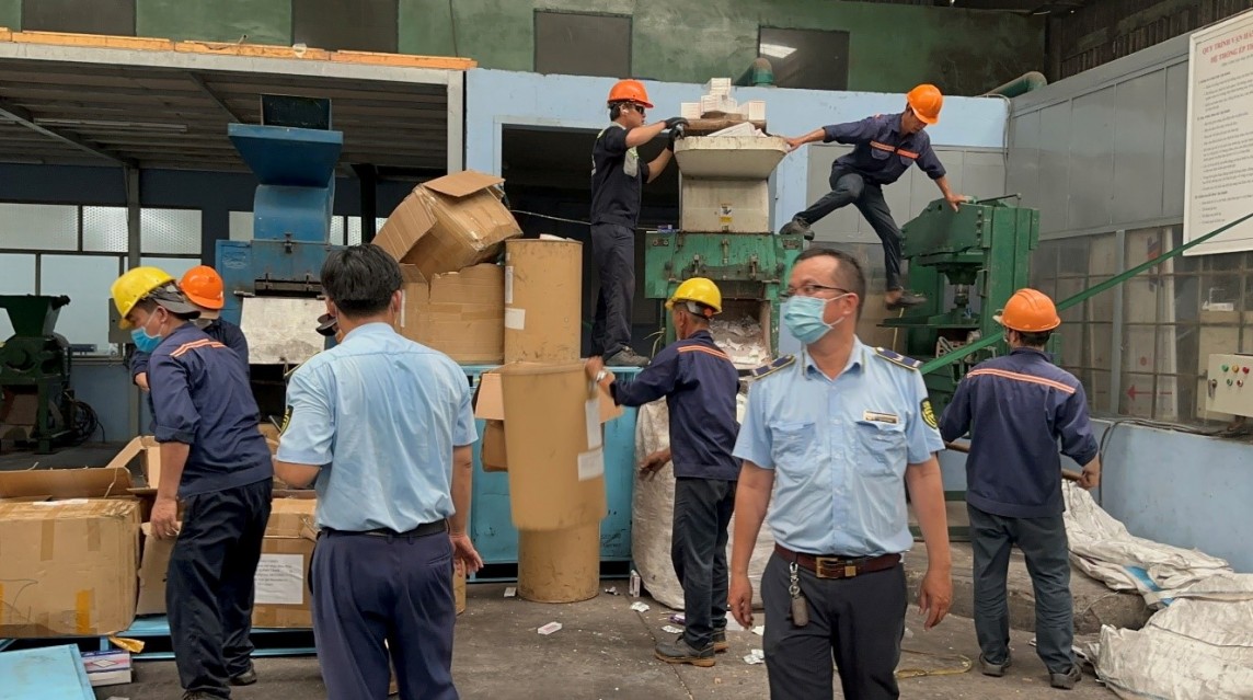 Quá trình tiêu hủy hàng hóa có sự giám sát chặt chẽ của Cục Quản lý thị trường Thành phố, đảm bảo yêu cầu kỹ thuật về môi trường.