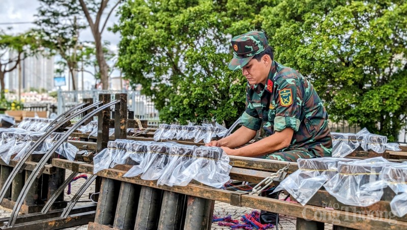 Thượng tá Lưu Phương Nam, Phó chỉ huy trưởng, Tham mưu trưởng Ban chỉ huy Quân sự TP. Thủ Đức cho biết, từ 5h sáng nay, việc lắp đặt "trận địa pháo hoa được diễn ra trong không khí khẩn trương và0 phải bảo đảm những quy trình nghiêm ngặt trước giờ khai hoả tối nay.