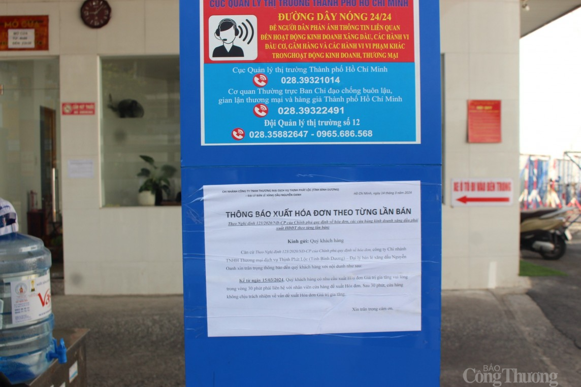 Tại cửa hàng xăng dầu Nguyễn Oanh (đường Phan Văn Trị, phường 7, quận Gò Vấp) đã có bảng thông tin: “Thông báo xuất hoá đơn theo từng lần bán kể từ ngày 15/3”.