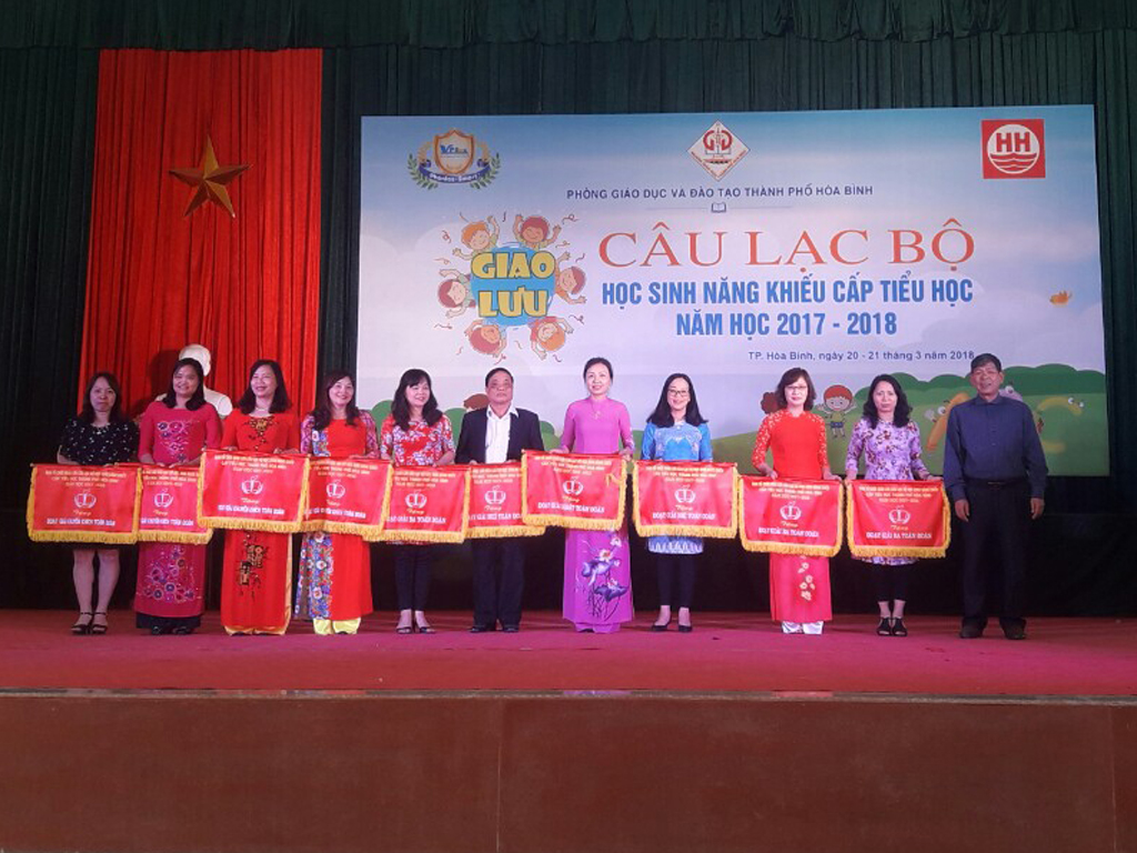 Đại diện Lãnh đạo UBND TP. Hòa Bình trao cờ lưu niệm cho các trường đạt giải Nhất, Nhì, Ba toàn đoàn tại giao lưu |