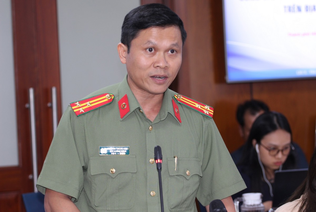 | Thượng tá Nguyễn Thăng Long, Phó Trưởng Phòng Tham mưu, Công an TP. Hồ Chí Minh tại buổi họp báo. Ảnh: Tiến Phòng |
