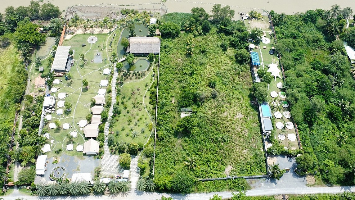 | Cách công trình Rio Glamping vài bước chân, A New Day Glamping East Saigon cũng xây dựng nhiều hạng mục kiên cố, lấn chiếm sông (Ảnh: Tấn Hiệp) |