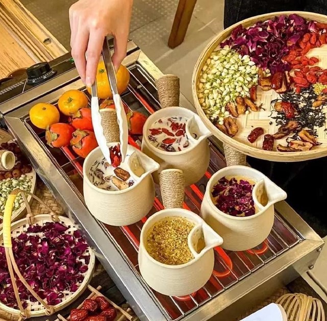 Một phần trà sữa hoàn chỉnh gồm hơn 14 loại nguyên liệu với khoảng 500ml trà sữa. Nồi có sẵn phần lọc nên trà rót ra không bị lẫn các cánh hoa hay thảo mộc. Khách có thể uống trực tiếp tại nồi đất hoặc đổ ra ly nhựa mang về.