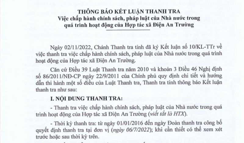 Thanh tra tỉnh Trà Vinh đã có thông báo kết luận thanh tra về việc chấp hành chính sách, pháp luật của Nhà nước trong quá trình hoạt động của hợp tác xã Điện An Trường (xã An Trường, huyện Càng Long) từ đầu năm 2016 đến giữa năm 2022.