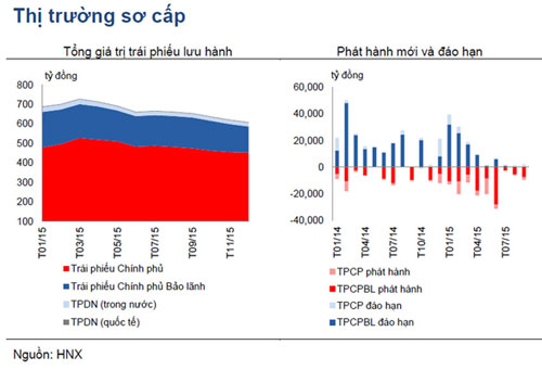 Cũng theo Bộ Tài chính, tính đến 14/8/2015, tổng khối lượng trái phiếu doanh nghiệp phát hành ra thị trường là 140.938 tỷ đồng; trong đó khối lượng phát hành TP Chính phủ là 123.479 tỷ đồng, bằng 49% kế hoạch năm 2015; khối lượng phát hành trái phiếu được chính phủ bảo lãnh là 17.459 tỷ đồng, bằng 36% kế hoạch năm 2015; khối lượng phát hành trái phiếu doanh nghiệp là 11.148 tỷ đồng. Ngoài ra, năm 2015 là năm đầu tiên phát hành thành công trái phiếu chính phủ kỳ hạn 20 năm (kỳ hạn dài nhất từ trước tới nay) cho các công ty bảo hiểm nhân thọ với khối lượng phát hành trong tháng 7/2015 là 3.450 tỷ đồng.