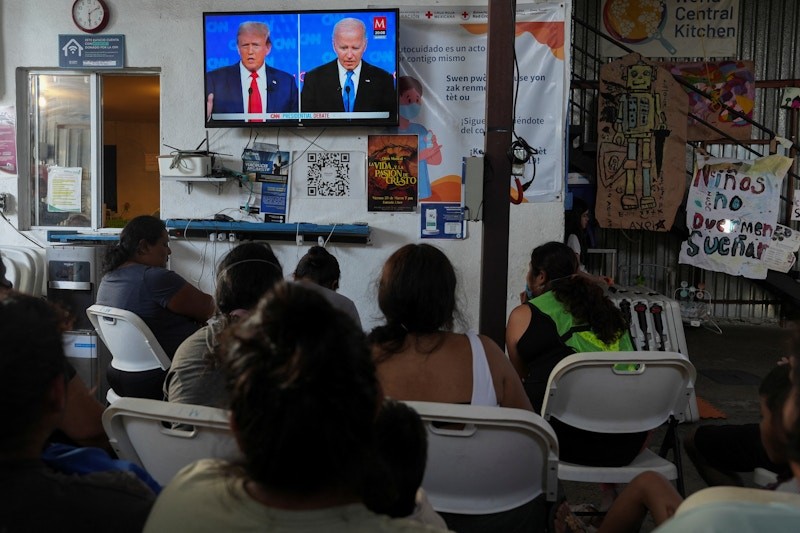 | Những người di cư theo dõi cuộc tranh luận trực tiếp (Ảnh: Reuters) |