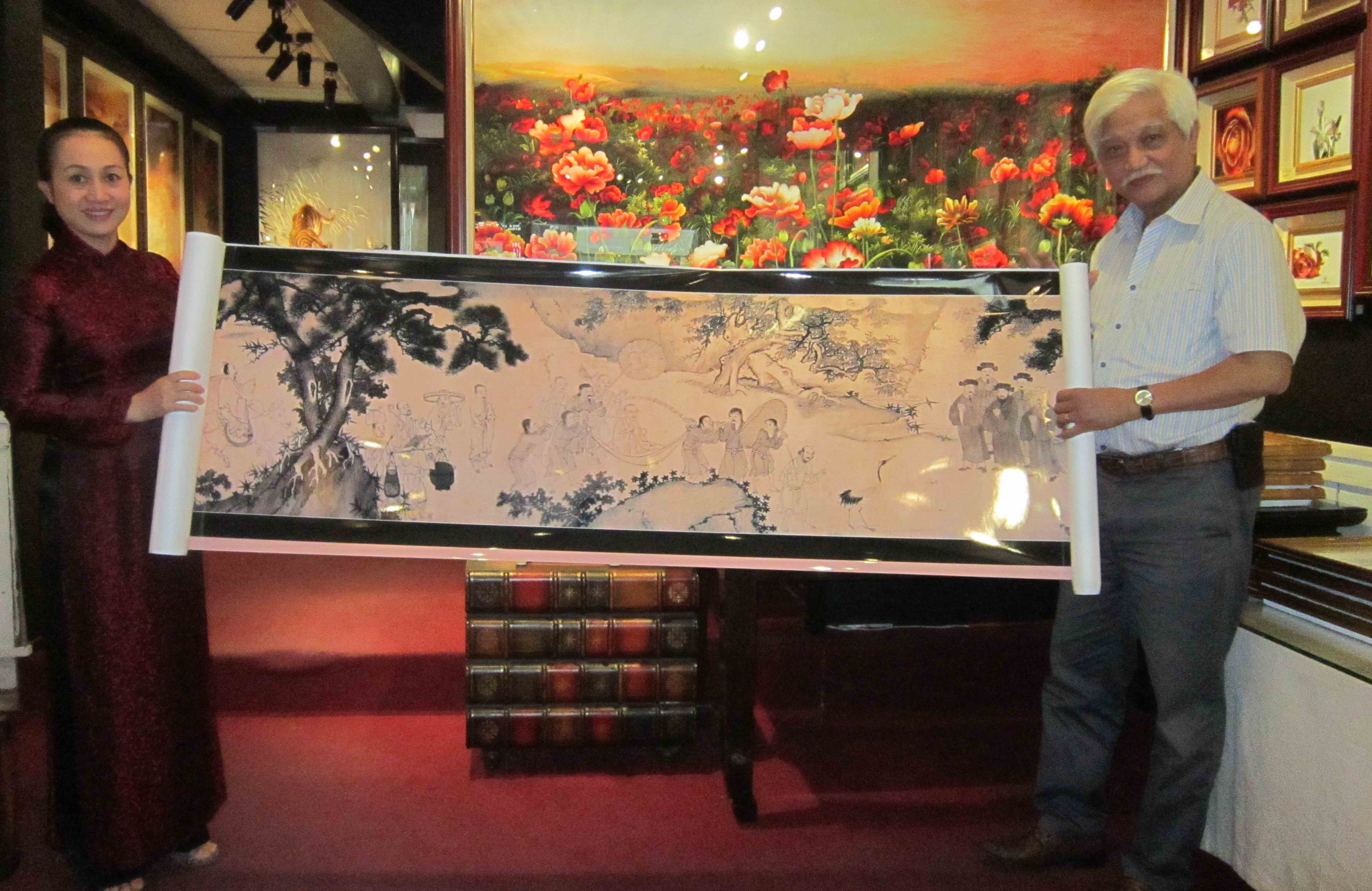 Nhà sử học Dương Trung Quốc tặng bức tranh “Trúc lâm đại sỹ xuất sơn đồ” cho XQ để thực hiện tác phẩm tranh thêu hai mặt lớn nhất Việt Nam