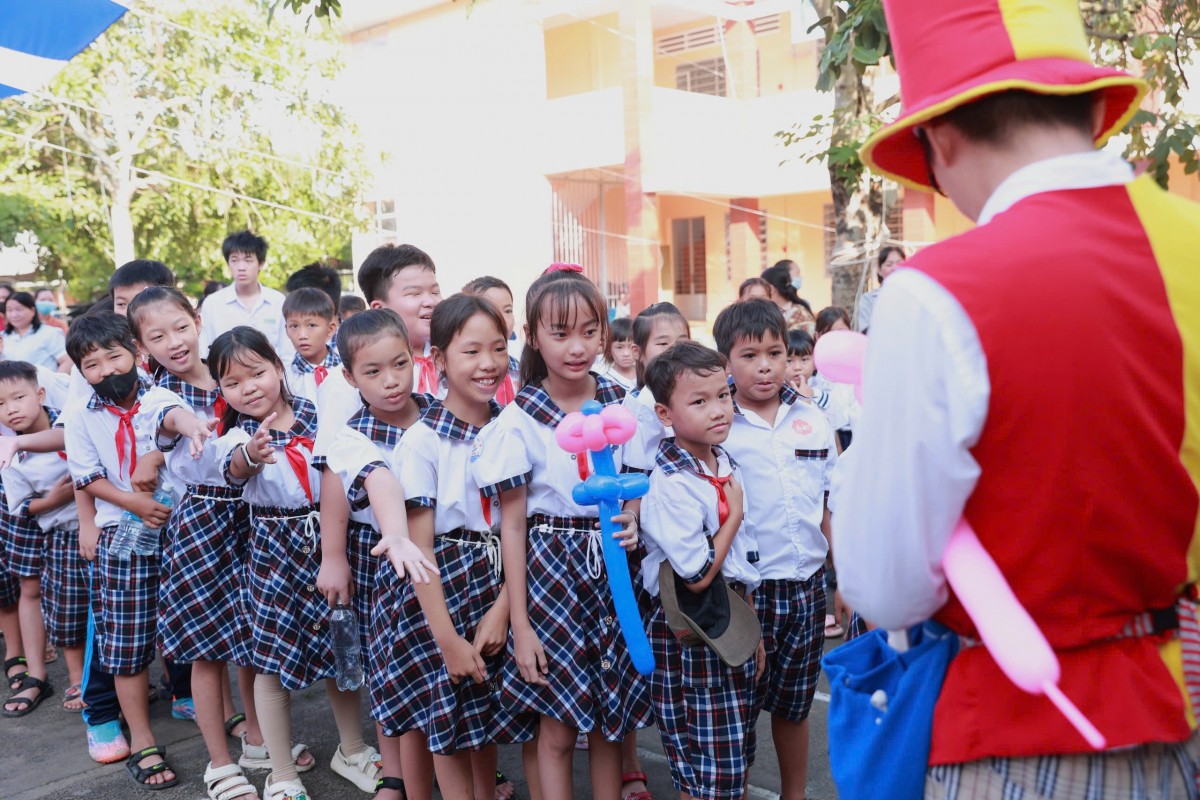 | Ánh mắt rạng ngời, háo hức cùng nụ cười giòn tan của các em học sinh khi được xem biểu diễn vẽ tranh cát, trình diễn múa rối, tham gia các trò chơi hoạt náo vui nhộn |