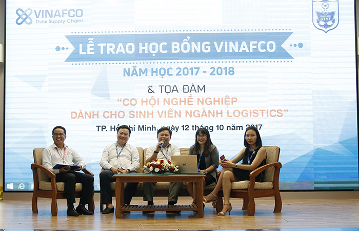 Trong khuôn khổ chương trình, Công ty Cổ phần Vinafco cùng với nhà trường còn tổ chức Tọa đàm nghề nghiệp nhằm giải đáp thắc mắc của các em sinh viên liên quan đến cơ hội việc làm ngành logistics.
