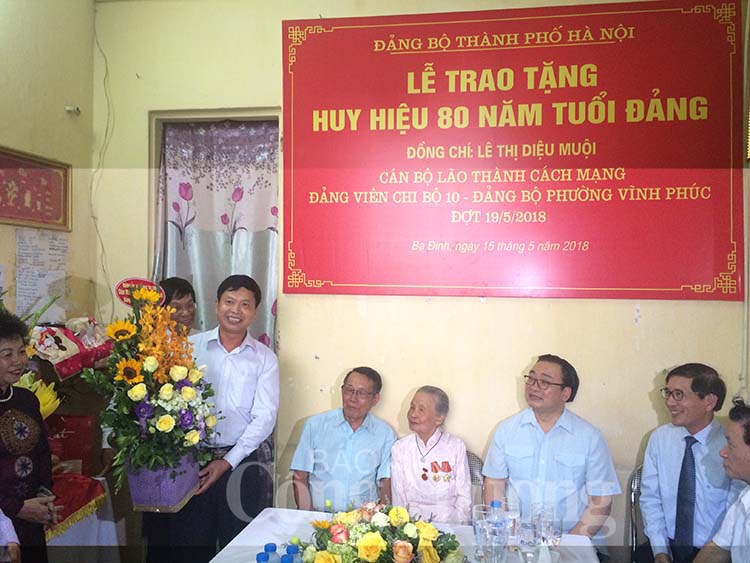 Trân trọng gắn tấm Huy hiệu 80 năm tuổi Đảng cho đồng chí Lê Thị Diệu Muội, Bí thư Thành uỷ Hà Nội Hoàng Trung Hải bày tỏ lòng biết ơn đối với công lao, đóng góp của bà đối với sự nghiệp cách mạng của Đảng và đất nước kể cả trong các cuộc kháng chiến cũng như trong quá trình xây dựng đất nước.