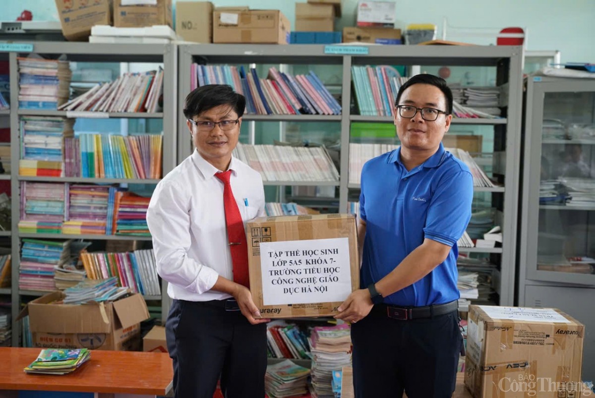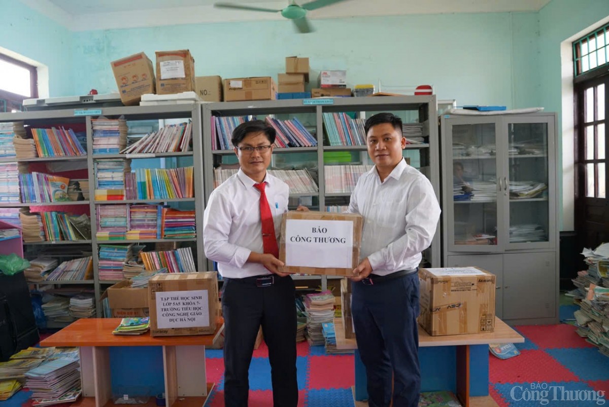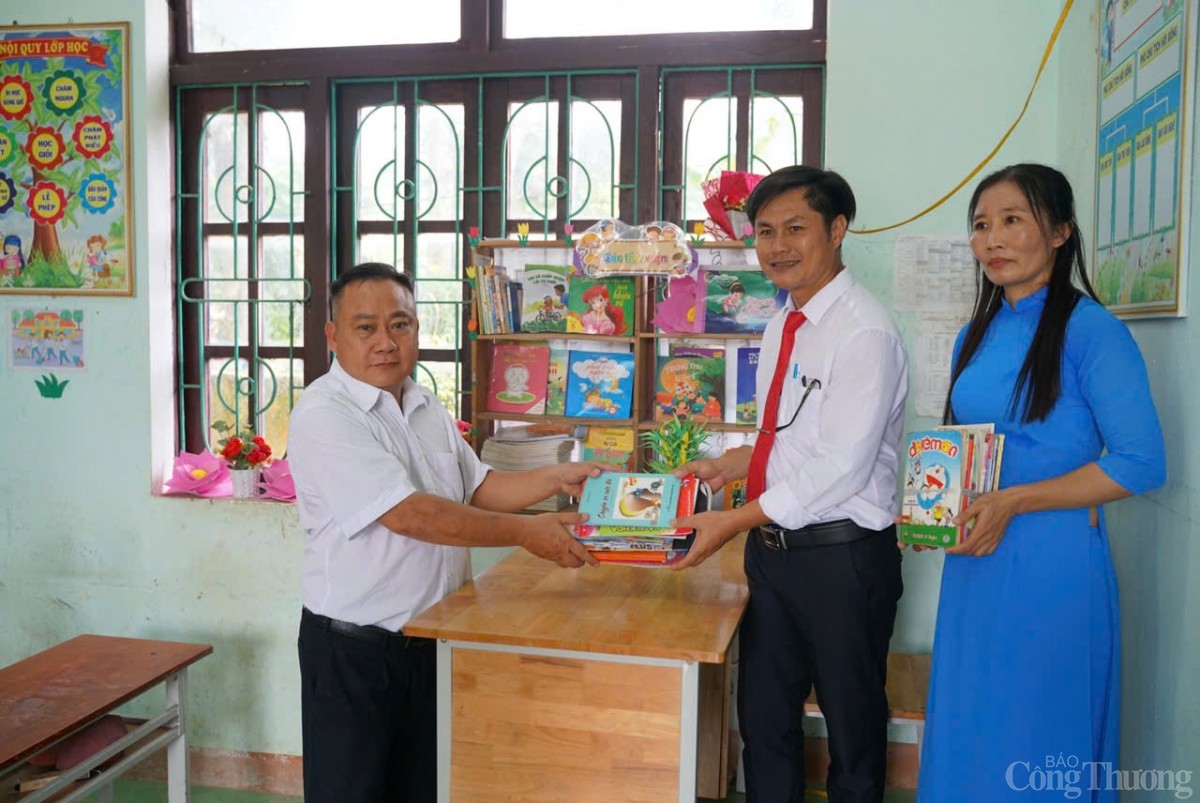 | Đại diện Báo Công Thương trao các bộ sách, vở mới cho thư viện trường học ở xã Kim Thuỷ |