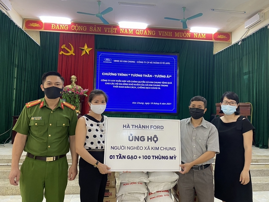 Là doanh nghiệp đóng chân và hoạt động trên địa bàn, thời gian qua, Công ty CP Hà Thành Ford cũng gặp rất nhiều khó khăn do dịch bệnh Covid-19. Nhưng với tinh thần tương thân tương ái, chia sẻ khó khăn với người dân trong bối cảnh dịch bệnh, qua kết nối từ Công an xã Kim Chung, công ty đã quyết định dành 100 suất quà gồm 1 tấn gạo và 100 thùng mỳ tôm để hỗ trợ cho các hộ dân gặp khó khăn.