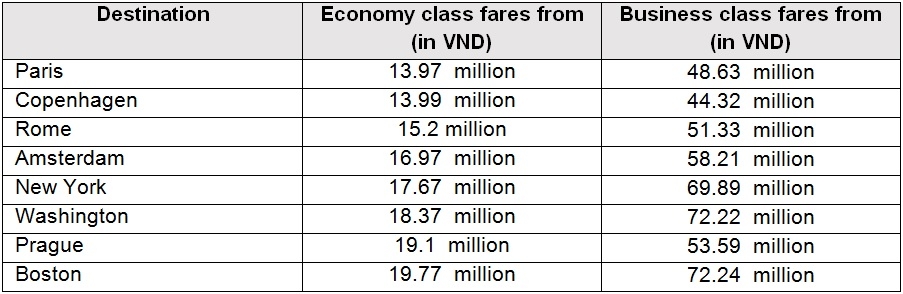Return fares start at only VND13.97 million in Economy Class or VND48.63 million in Business Class. The fares are available until 29 March 2020 and are valid for travel from 14 March 2020 to 30 November 2020.