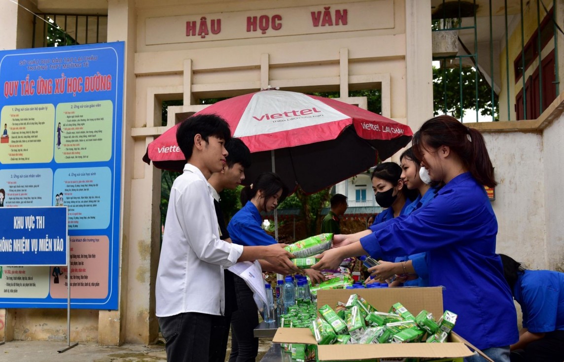 | Lực lượng đoàn viên, thanh niên phát bánh, sữa miễn phí cho thí sinh trước khi vào thi tại điểm thi Trường THPT Mường Tè |