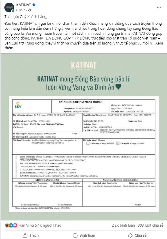 Katinat xin lỗi, đồng thời gửi 1 tỷ đồng ủng hộ thiệt hại bão số 3. Ảnh chụp màn hình