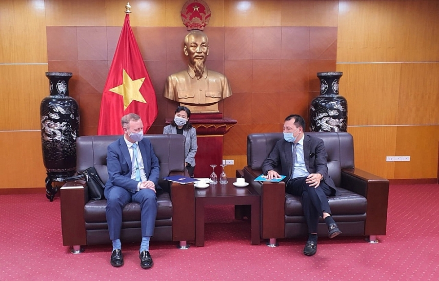 | Thứ trưởng Đặng Hoàng An làm việc với ông Gareth Ward, Đại sứ Vương quốc Anh tại Việt Nam để trao đổi về hợp tác trong lĩnh vực thương mại và năng lượng giữa hai nước. |