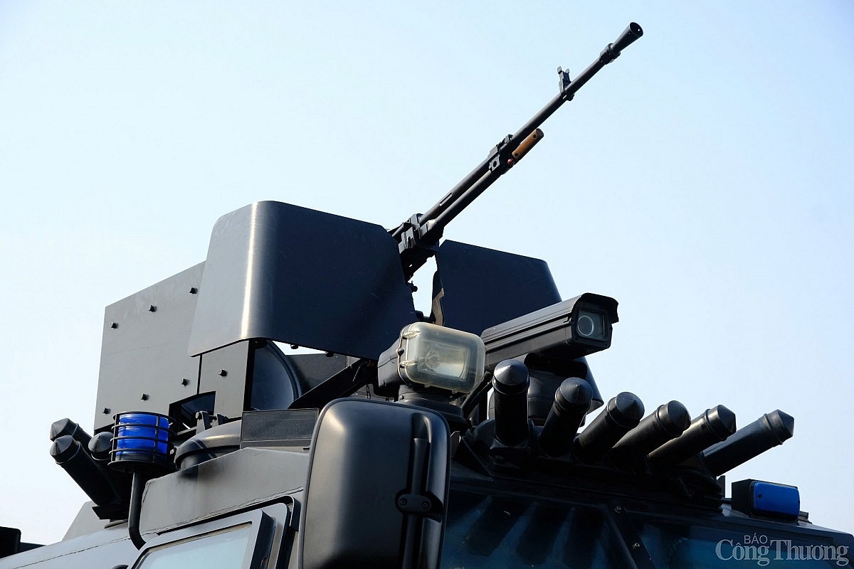 | Xe được thiết kế với rào chắn thép chịu lực, hệ thống phun nước, khí gas và đạn hơi cay, giúp kiểm soát và bảo vệ các khu vực trọng yếu trước nguy cơ xâm nhập trái phép. - Ảnh: Thế Duy |