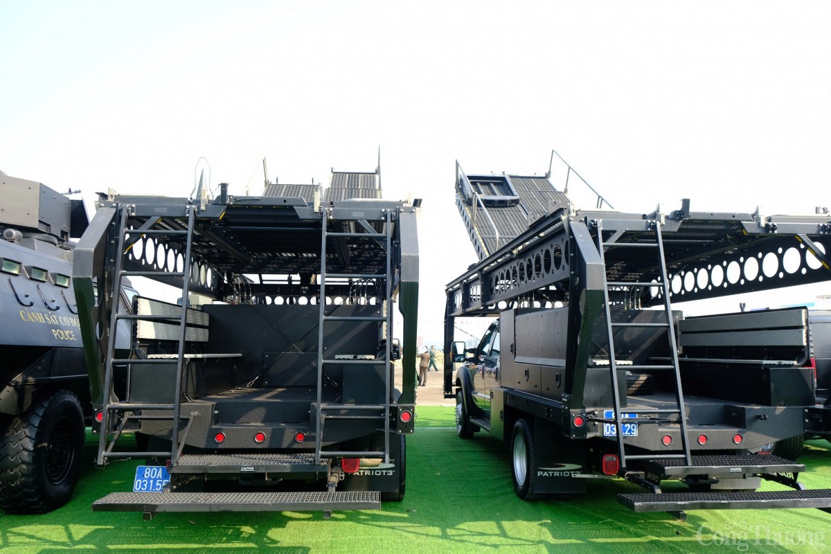 Bên cạnh đó, xe phóng thang của hãng Patriot (Mỹ) gây ấn tượng với hệ thống thang độc lập có thể vươn cao trong thời gian ngắn, giúp cán bộ chiến sĩ nhanh chóng tiếp cận các vị trí trên cao trong các nhiệm vụ chống khủng bố và giải cứu con tin. Xe còn tích hợp bệ ngắm dành cho tác chiến tầm cao, kính chắn gió chống đạn và camera giám sát hỗ trợ xử lý tình huống.