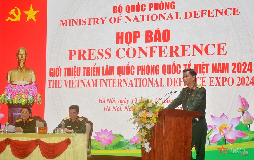 | Đại tá Đặng Thanh Minh - Phó cục trưởng Cục Đối ngoại phát biểu tại họp báo. - Ảnh: QĐND |
