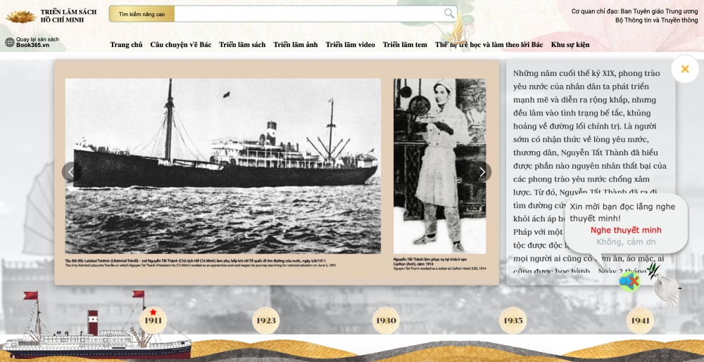 Đặc biệt, nét mới và điểm khác biệt của Triển lãm sách trực tuyến năm nay là ở việc ứng dụng công nghệ kết nối 4.0 cải tiến giao diện và ứng dụng công nghệ tối đa nhằm kết nối bạn đọc với Triển lãm và Hội sách một cách trực quan sinh động. Cụ thể, để tái hiện lại hành trình 30 năm Bác ra đi tìm đường cứu nước triển lãm ứng dụng công nghệ Hoạt cảnh tương tác animation 4.0 do Vitranet24 tài trợ, mô tả hình ảnh con tàu Đô đốc Latouche-Tréville đưa bạn đọc đi qua từng chặng chặng trên hành trình của Bác từ năm 1911 đến hết năm 1941, qua mỗi giai đoạn người xem có thể hiểu hơn về những sự kiện, những mốc thời gian Bác đã đi qua bằng những hình ảnh và thuyết minh sinh động như một triển lãm ngoài thực địa. Đặc biệt công nghệ này khác hẳn công nghệ ảnh gif, dù rất nhiều hoạt cảnh nhân vật xuất hiện nhưng người xem vẫn tương tác được bình thường trên website mà không bị ảnh hưởng.