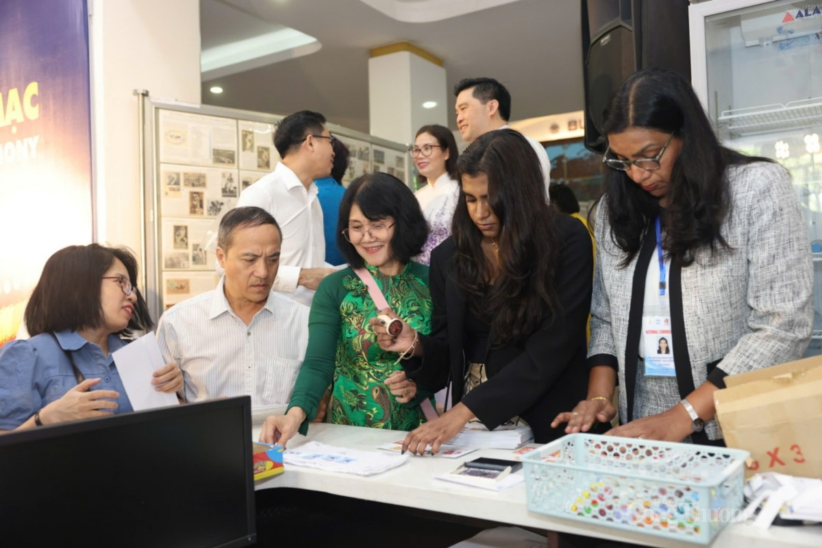 | Khách nước ngoài mua tem tại sự kiện |