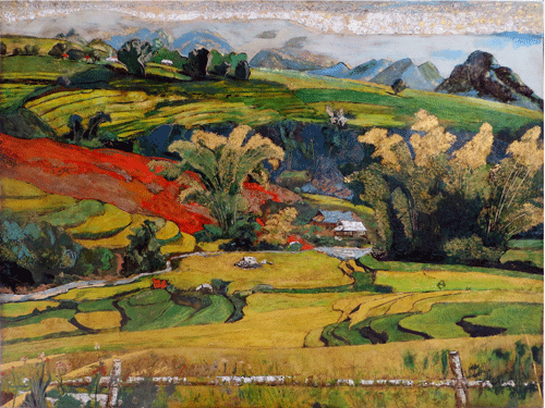 Tranh sơn mài "Mùa lúa chín Tây Bắc" của họa sỹ Nguyễn Thị Tiến