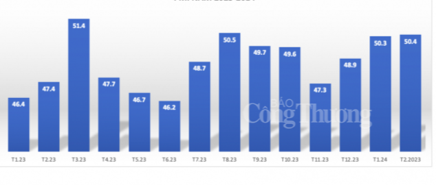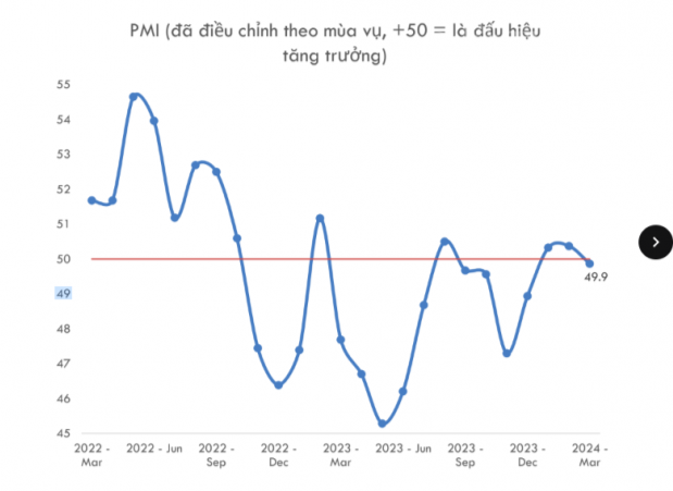 Chỉ số nhà quản trị mua hàng (PMI) của Việt Nam đã tăng từ mốc 48,9 điểm vào tháng 12/2023 lên mức 50,3 điểm và 50,4 điểm vào tháng 1 và tháng 2/2024. Tuy nhiên, tháng 3/2024, chỉ số này lại giảm xuống mốc 49,9 điểm.