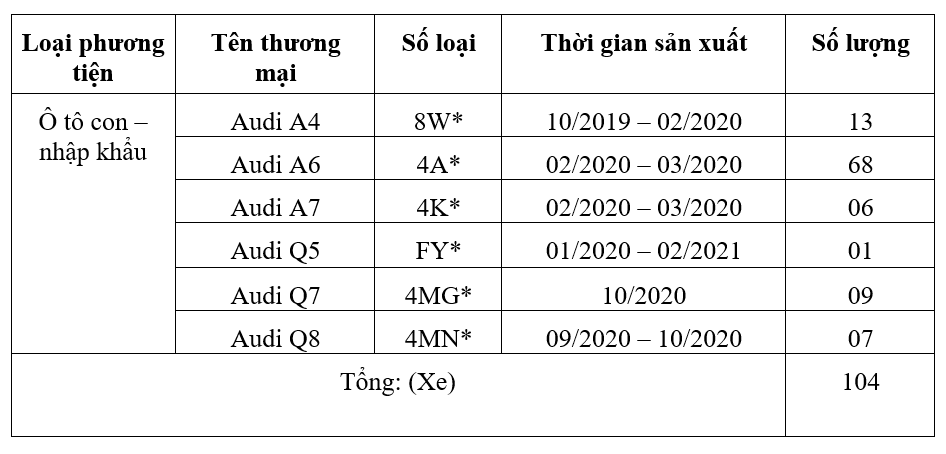 | Chi tiết các model xe Audi do Công ty TNHH Ô tô Á Châu nhập khẩu và phân phối được triệu hồi |