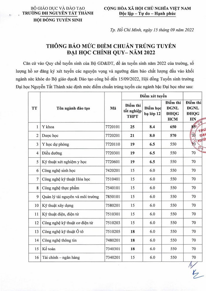 Điểm chuẩn theo phương thức xét điểm thi tốt nghiệp THPT của Đại học Nguyễn Tất Thành nằm trong khoảng từ 15 đến 25 điểm: