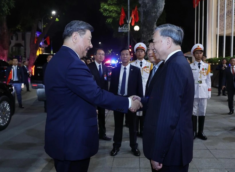 | Tổng Bí thư Tô Lâm và Chủ tịch nước Lương Cường đón Tổng Bí thư, Chủ tịch nước Trung Quốc Tập Cận Bình đến dự chiêu đãi. Ảnh: TTXVN |