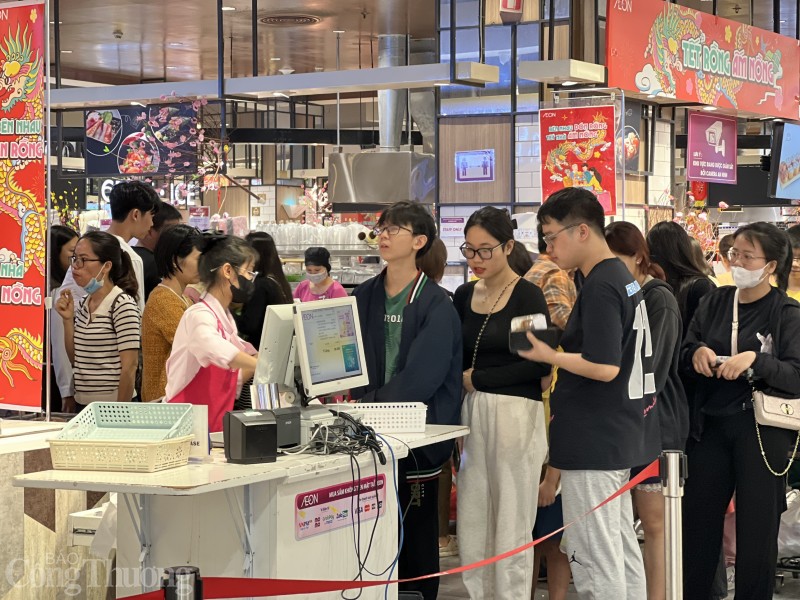 Khu vực ẩm thực cũng chật kín khách đợi thanh toán |