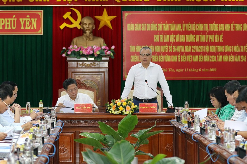 Tại buổi làm việc, ông Trần Tuấn Anh - Ủy viên Bộ Chính trị, Trưởng Ban Kinh tế Trung ương nhìn nhận Phú Yên là tỉnh thuộc vùng Duyên hải Nam Trung bộ, có nhiều lợi thế để phát triển kinh tế biển. Ông bày tỏ vui mừng với những kết quả tích cực mà Phú Yên đã đạt được trong việc thực hiện Nghị quyết số 36 về Chiến lược phát triển bền vững kinh tế biển Việt Nam đến năm 2030, tầm nhìn đến năm 2045.