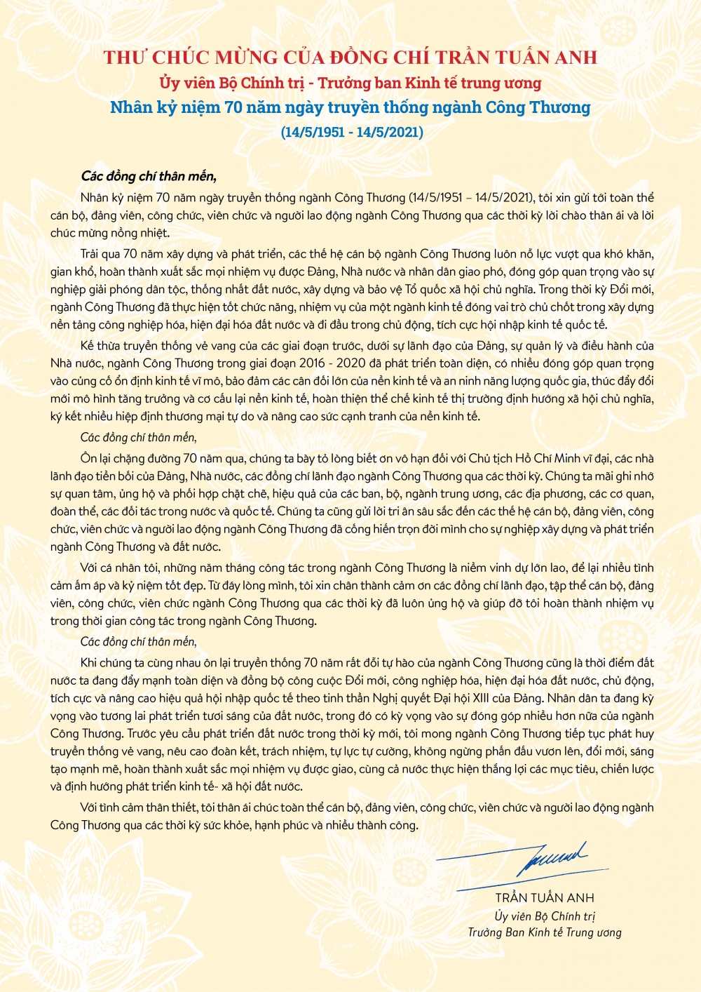 Nhân dịp kỷ niệm 70 năm Ngày truyền thống ngành Công Thương (14/5/1951 - 14/5/2021), Đồng chí Trần Tuấn Anh, Ủy viên Bộ Chính trị - Trưởng ban Kinh tế Trung ương gửi thư chúc mừng cán bộ, công chức, viên chức, người lao động ngành Công Thương.