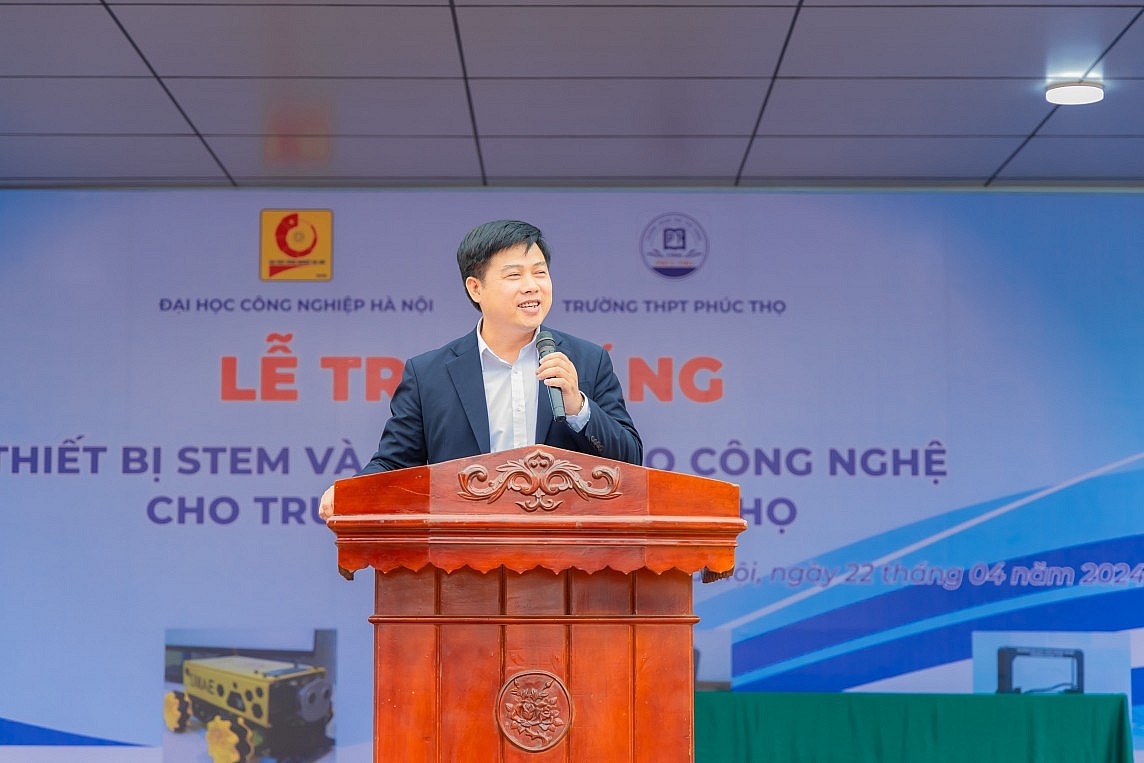 PGS.TS.Hoàng Tiến Dũng – Hiệu trưởng Trường Cơ khí – Ô tô, Đại học Công nghiệp Hà Nội phát biểu tại chương trình ký kết và trao tặng thiết bị và chuyển giao công nghệ STEM cho Trường THPT Phúc Thọ, Hà Nội |