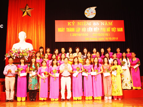 TS.Vũ Quang Thập - Phó Hiệu trưởng và Chủ tịch Công đoàn Vũ Xuân Bính trao phần thưởng cho nữ CBCNVC xuất sắc năm 2015 |