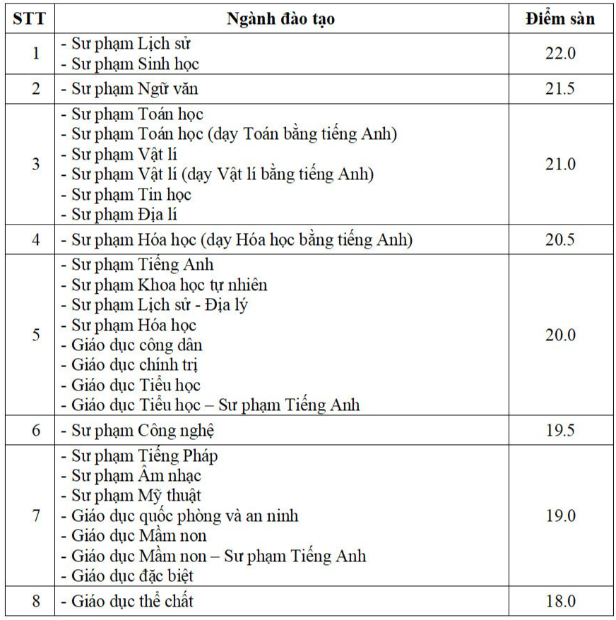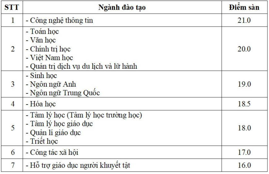Mức điểm sàn xét tuyển của trường thấp nhất là 16 điểm ở ngành hỗ trợ giáo dục người khuyết tật và cao nhất 22 điểm ở ngành sư phạm lịch sử và sư phạm sinh học.
