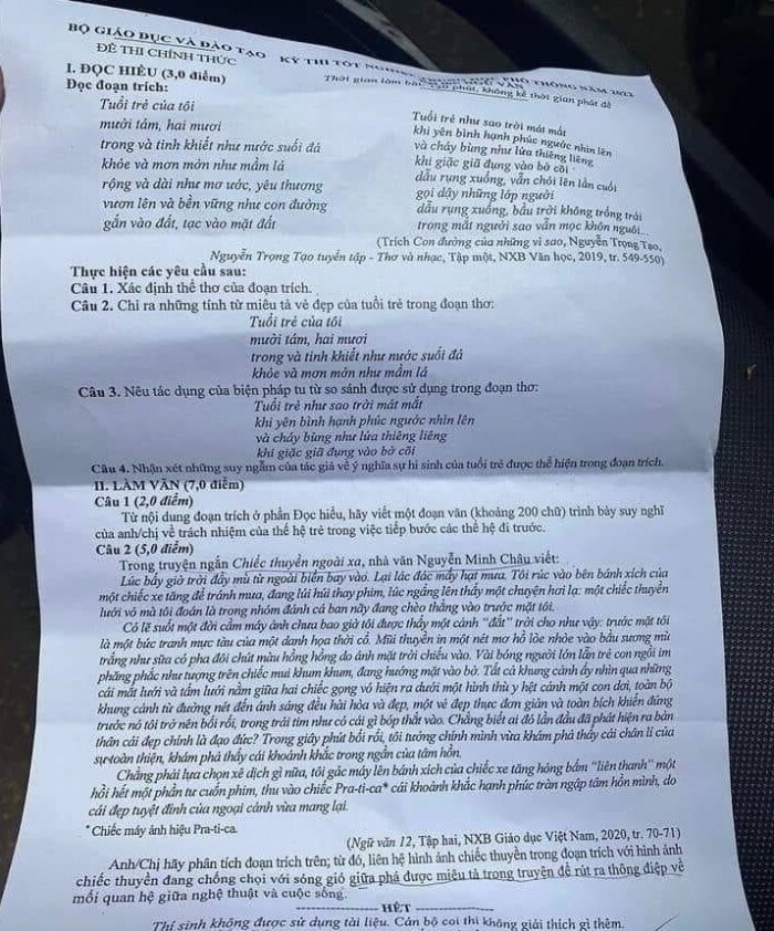 | Đề thi môn Ngữ văn chính thức kỳ thi tốt nghiệp THPT 2022. |