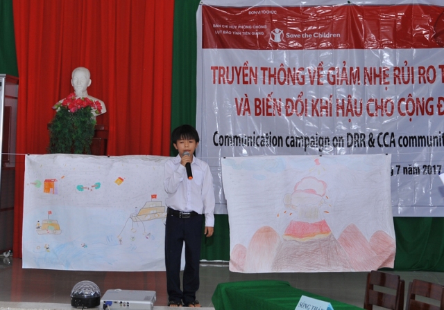 | Học sinh thuyết trình tranh vẽ về thiên tai và biến đổi khí hậu |