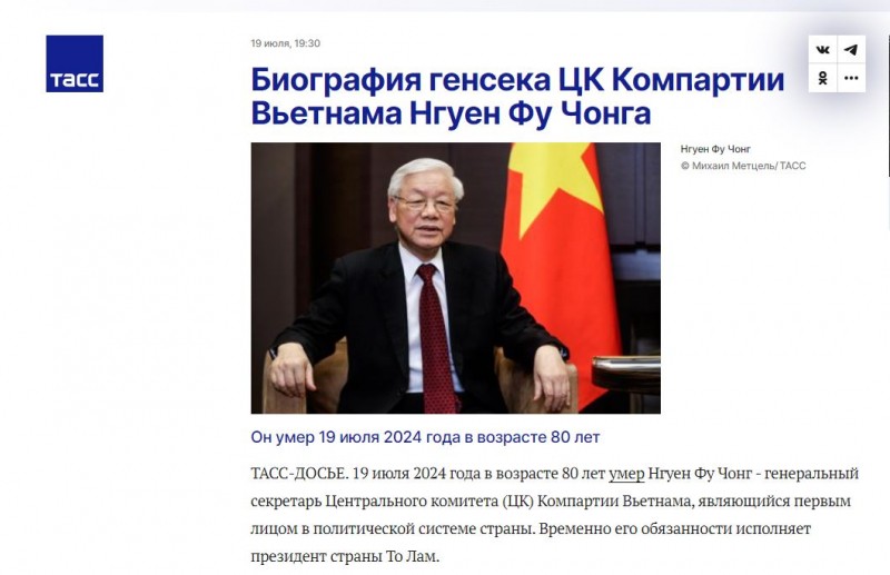 | Hãng thông tấn TASS của Nga đưa tin về Tổng Bí thư Nguyễn Phú Trọng |
