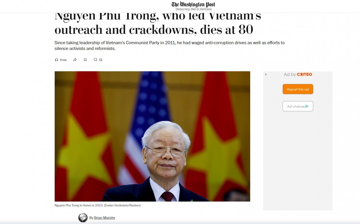 Tờ Washington Post của Mỹ đưa tin: "Ông Nguyễn Phú Trọng, Tổng Bí thư Đảng Cộng sản Việt Nam từ trần do tuổi cao và bệnh nặng. Ông hưởng thọ 80 tuổi".