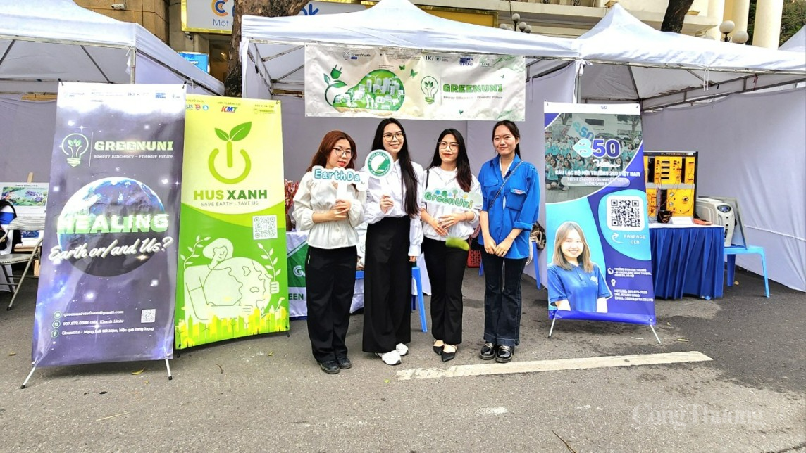 | Các bạn trẻ tham gia tuyên truyền về sống xanh, sử dụng năng lượng tiết kiệm tại sự kiện |