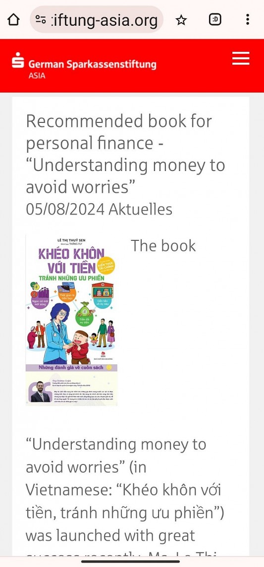 Theo bài viết được đăng tải vào ngày 8/5/2024 trên website https://sparkassenstiftung-asia.org gần đây, đã đánh cuốn sách “Khéo khôn với tiền - Tránh những ưu phiền” khá tích cực.