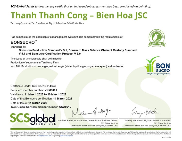 TTC AgriS vinh dự là đơn vị đầu tiên tại Việt Nam đạt được chứng nhận từ đơn vị đánh giá SCS của Mỹ chứng nhận về tiêu chuẩn Bonsucro - tổ chức chứng nhận có uy tín trên thế giới.