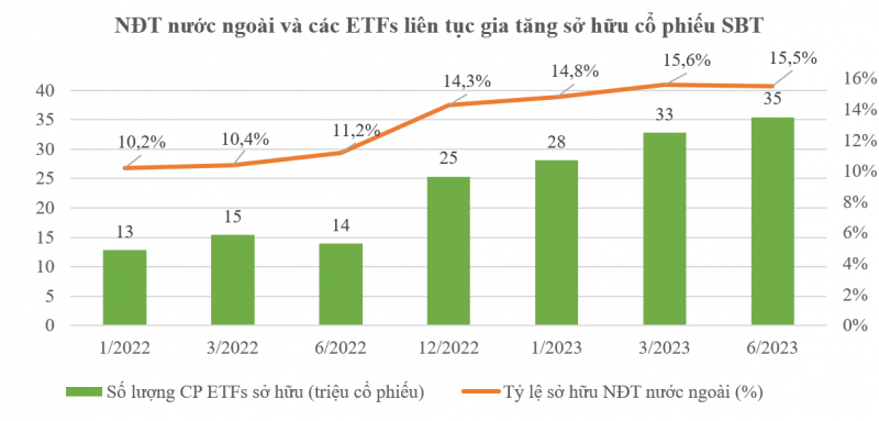 Tính đến thời điểm 30/6/2023, tổng số cổ phiếu SBT các ETFs đang nắm giữ hơn 35 triệu cổ phiếu, tăng 154% so với cùng kỳ năm 2022. Đặc biệt, quỹ Fubon FTSE Vietnam ETF đã liên tục gia tăng tỷ lệ sở hữu SBT, cụ thể tăng từ ~4 triệu lên ~19 triệu cổ phiếu tương đương tăng hơn 390% so với cùng kỳ năm 2021, tăng từ ~6 triệu lên ~19 triệu cổ phiếu tương đương tăng hơn 230% so với cùng kỳ năm 2022.