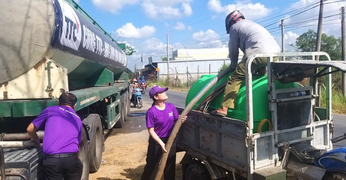| Nhân sự TTC Hospitality khu vực Bến Tre san sẻ nguồn nước mát lành đến bà con vùng nắng hạn. |